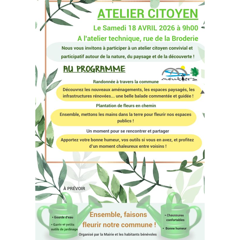Atelier citoyen, le samedi 18 avril 2026 de 9h à 12h : venez biner, planter, diviser, se balader... dans la bonne humer et le partage.